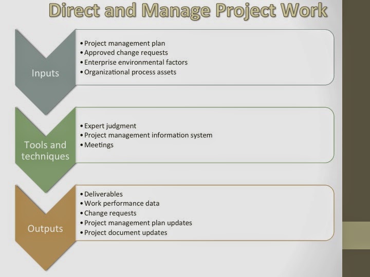 • This process helps you lead and perform the work defined in the project management plan as well as implement the approved changes to achieve the project's objectives.